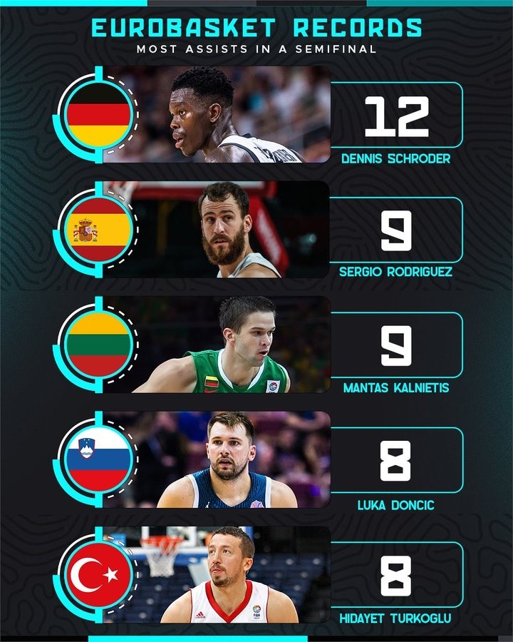 根据数据统计,施罗德此役送出12次助攻,这是欧锦赛半决赛历史纪录。此前的纪录保持者是西班牙球员塞尔吉奥-罗德里格斯和立陶宛球员曼塔斯-卡尼提斯,两人都曾在欧锦赛半决赛上送出9次助攻。