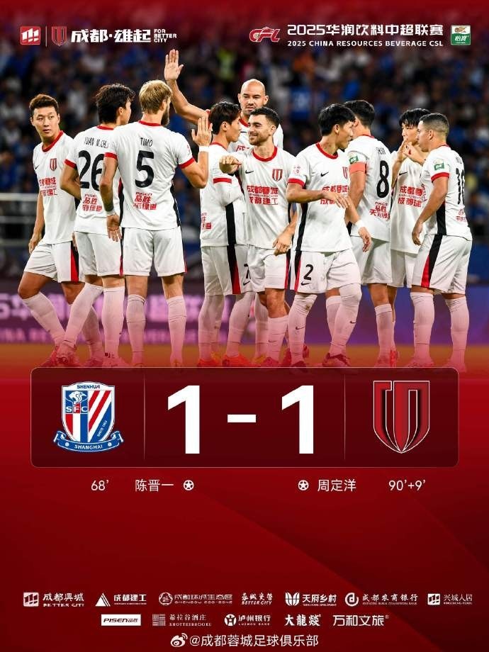 9月21日晚,2025华润饮料中超联赛第25轮,成都蓉城客场挑战上海申花。上半场第12分钟韦世豪发力攻门后不慎拉伤下场,成都蓉城被迫做出换人调整,小将廖荣祥替补登场;第33分钟,罗慕洛假射真传险些打穿对方防线,半场战罢,场上比分0-0。下半场易边再战,对手抓住反击机会先行破门,比分0-1。成都蓉城此后多次做出换人变换阵型,甘超、严鼎皓、唐创、李漠雨先后登场。终于在第90+9分钟,周定洋读秒绝杀!成都蓉城1-1战平上海申花,在客场拿下关键1分!